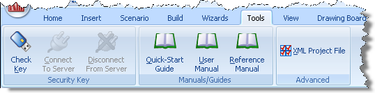 The commands on the Tools tab are arranged into the following groups: Tools, Manuals/Guides, and Advanced.